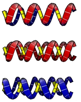 image of two left handed helixes, two right handed helixes, and one left handed and one right handed helix